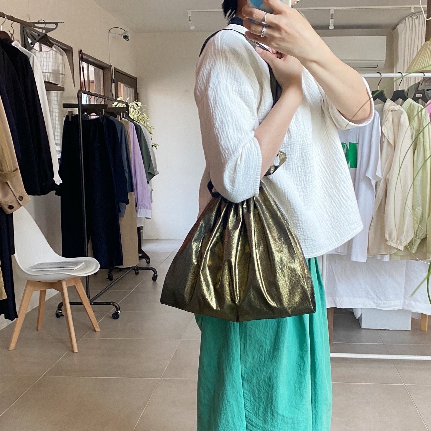持ち手が2WAY仕様で、口元の紐を絞ると巾着のようなシルエットにもすることができます。
