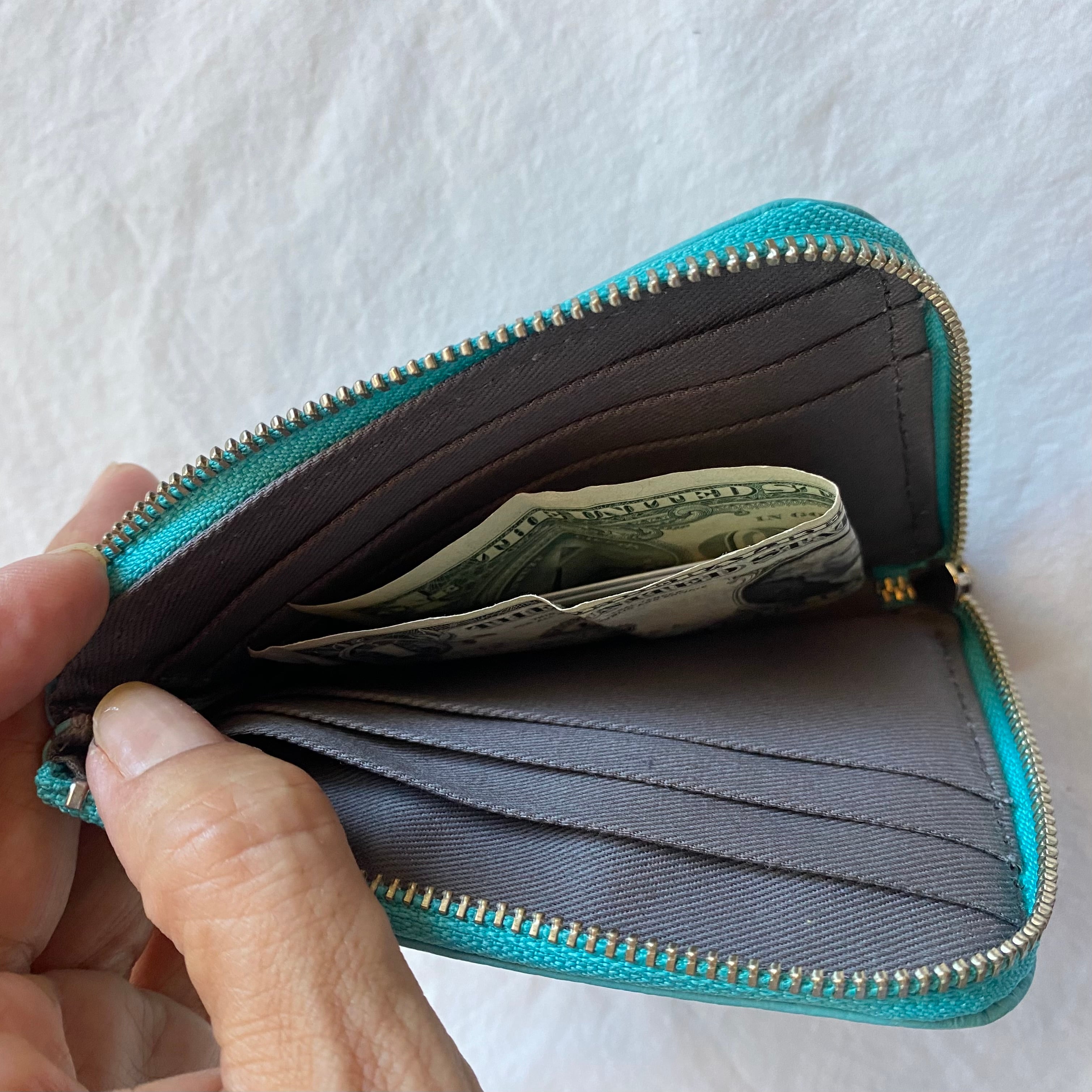 カードは8枚収納可能。お札は二つ折りで入れられ、