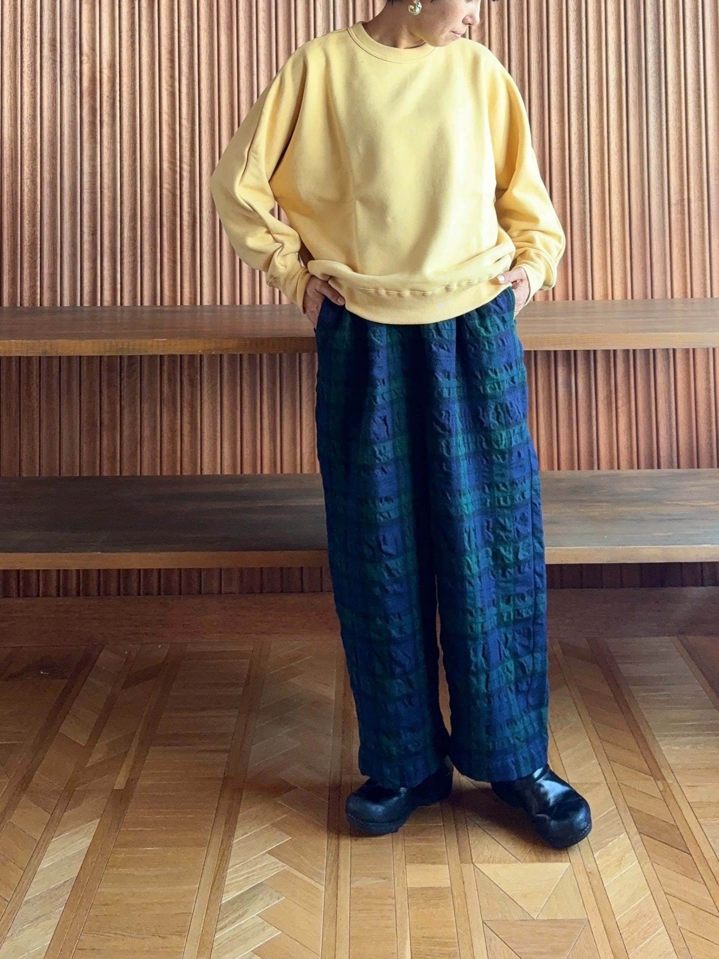 ポコポコした表面感のタータンチェック柄が印象的なコットンウール素材のイージーパンツです