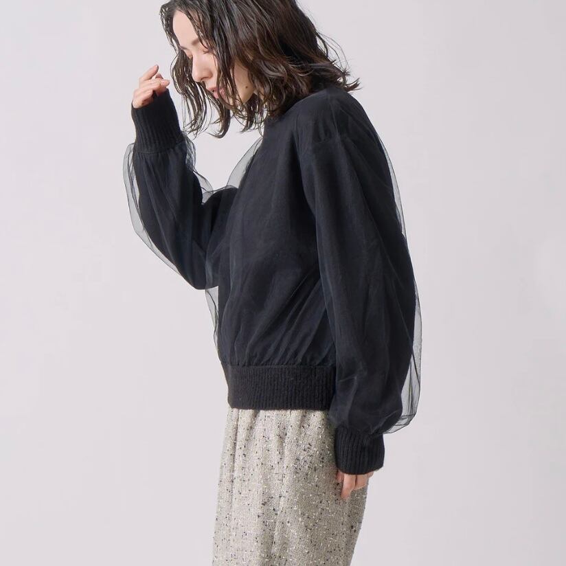 チュールとニットのカラーを配色にし、チュールのシアー感と重なって見えるニットのカラーが奥行きを持たせてくれるニットです。