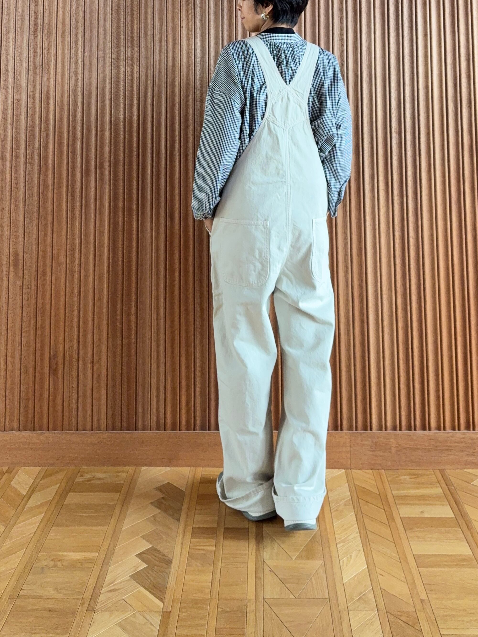人気のオーバーオール、ゆったりした股下のシルエットとは対照的にクロスした上身頃バックスタイル
