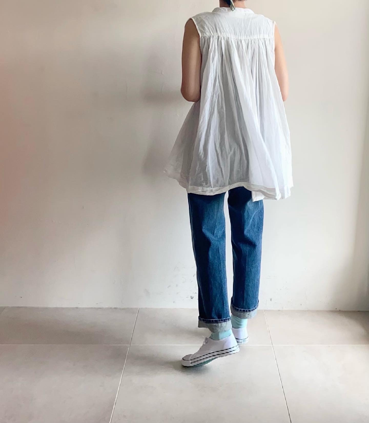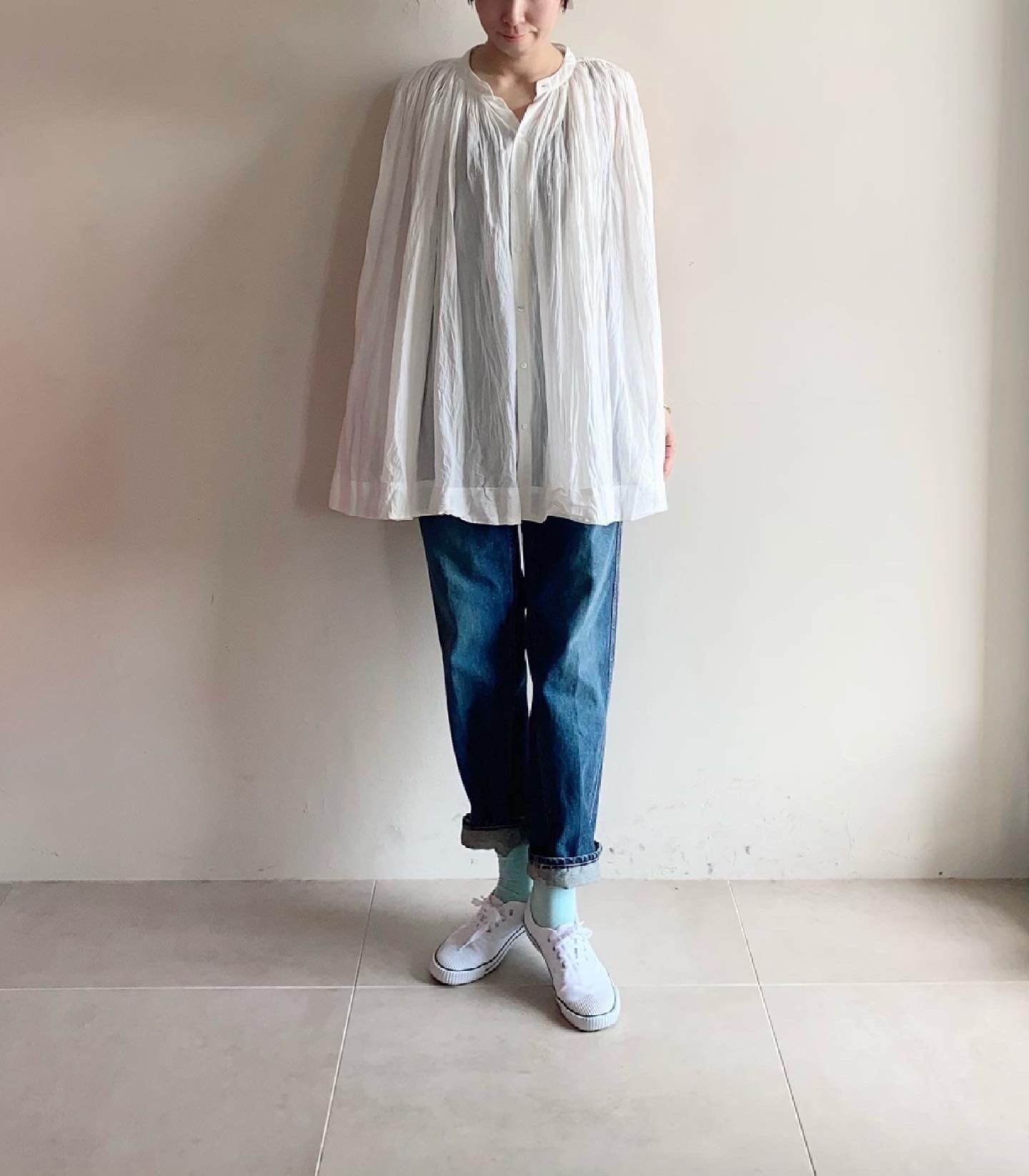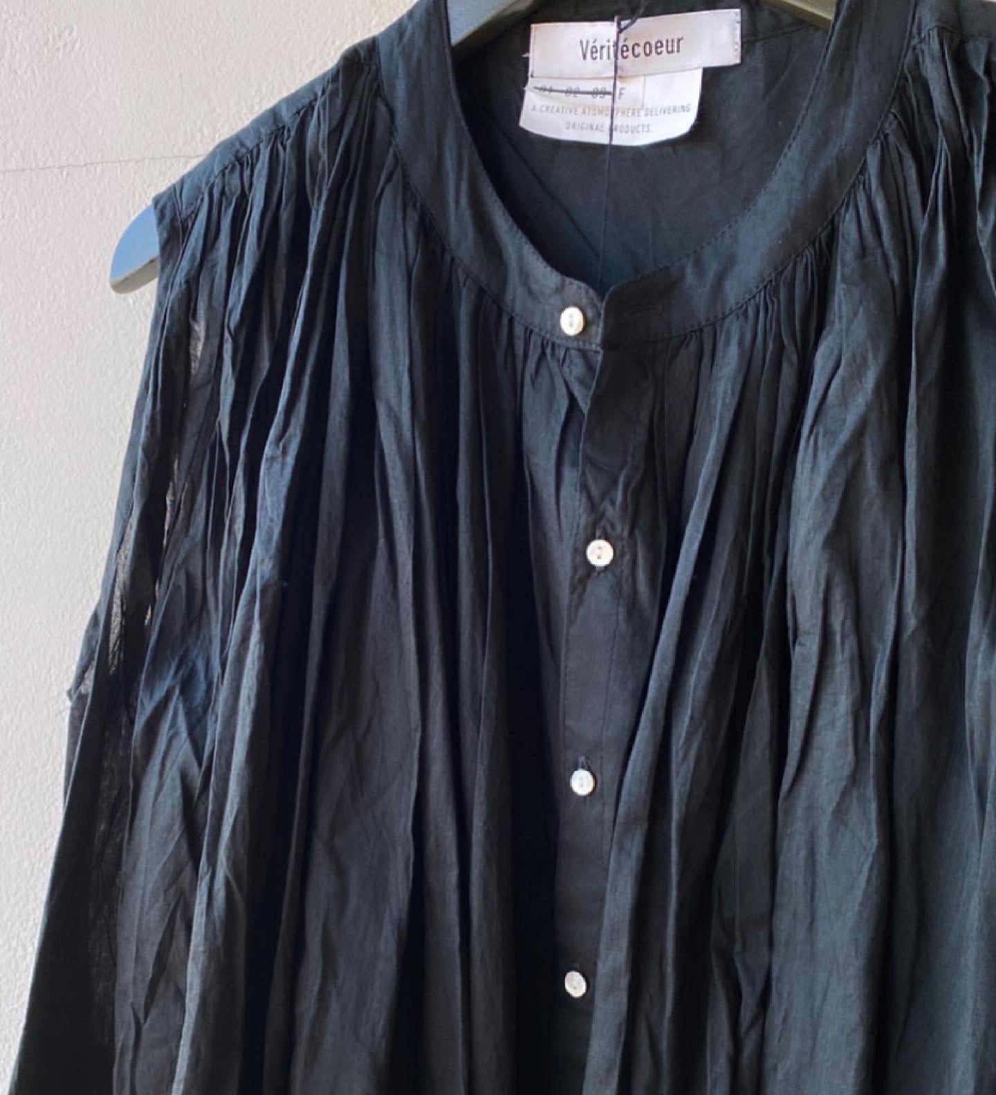 前後ともに、肩周りにたっぷり寄せられた繊細なギャザーが美しい一着